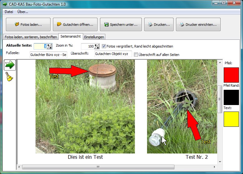 Die Fotos mit können freien Untertiteln (wie "Fenster links", "Schimmelbefall") versehen werden. Eine Kennzeichnung mit Pfeil und Text im Bild ist möglich, z.B. "Riß an Außenwand", "Ausblühung" usw.