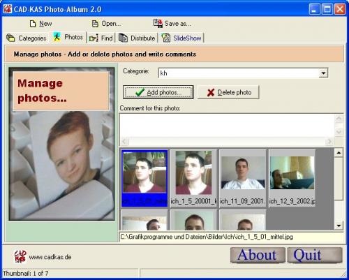 Manage and categorize your digital photos. You can add your photos to different categories and write a comment to each photo. Each photo is shown as thumbnail in the preview. You can view and print your photos in full quality. Distribute the photos and the album files on CD. Or create a slide show out of your photos. Many different fade in and out effects make be used.