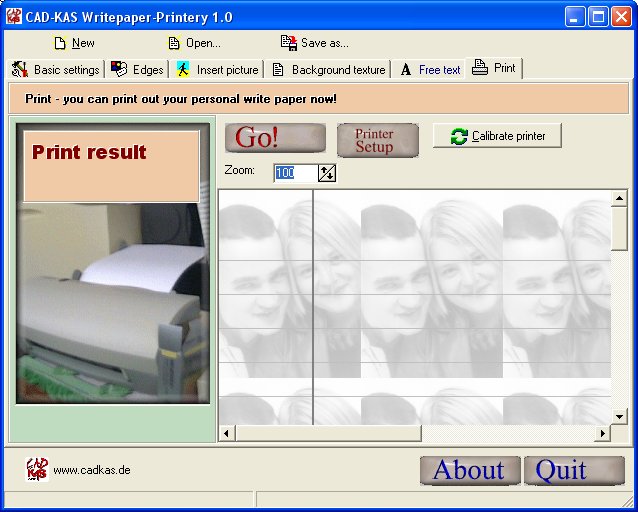 Do you ever wanted to create and print your personal writing paper? With Writepaper-Printery this is no longer a problem. Design ruled or checkered paper with individual colors, line widths and edges. Additionally you can insert a picture and use a background texture and a free text to design your personal writing paper. You can lighten the background texture so that it does not disturb.