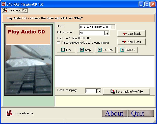 PlayAnyCD helps you to play and ripp even scractched music CD's on your PC. If your CD drives can detect the CD your chances are good to play it on your PC! You can save the tracks as WAV files. The program has a Karaoke mode in which you hear only the background music.