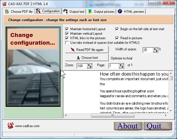 PDF 2 HTML can open PDF files. It recognizes the texts, the layout