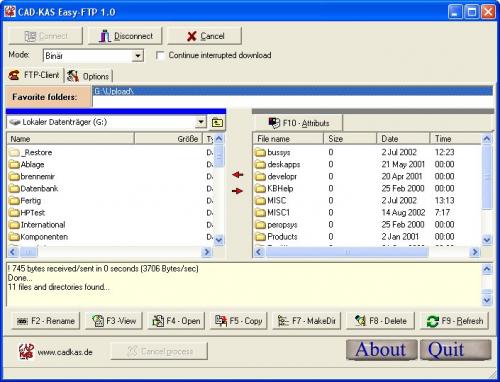 With Easy-FTP you can transfer files between your PC and a FTP server. So you can upload files to your homepage or download files from a public FTP server. The program can continue interrupted download. It can delete folders with all subfolders and containing files. You can comfortable manage your favorite FTP servers. Often used folders can be reached with one click. A file on a server can be downloaded, edited and uploaded within one step through the edit function. File attributes needed for CGI scripts can be setted with one click.