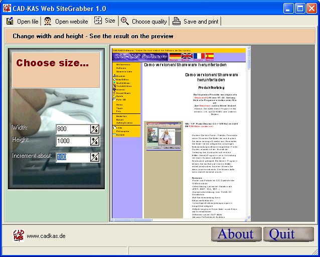 The program converts websites (HTML) into bitmap files. You can save this bitmaps as JPG, TGA, TIF, ... files. So you have the whole website as one bitmap files. You can select the output quality and size of the bitmap. The program is especially useful together with "CAD-KAS Poster-Printery". With both programs together it is possible to print websites as big posters.