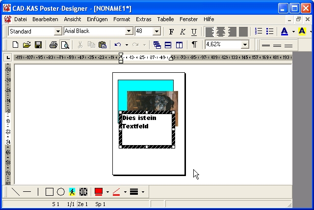 Mit diesem Programm können Sie Poster und Plakate entwerfen. Sie können Texte, Bilder und Grafikobjekte zu einem Plakat zusammenstellen. Poster-Designer arbeitet mit der Technik des verteilten Ausdrucks auf mehrere Blätter.Durch eine spezielle Klebetechnik können Sie die einzelnen Blätter zu mehrere Meter großen Postern zusammenfügen.