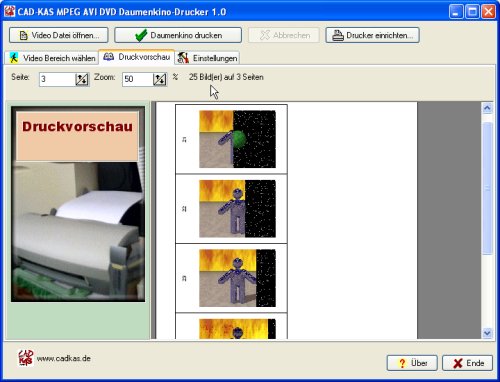 Drucken Sie Ihr eigenes Daumenkino! Daumenkinos werden immer beliebter, jetzt erstellen Sie Ihre eigenen! Verwenden Sie z.B. Filmmaterial vom Camcorder oder von der Digicam. Sie wählen einen Film im AVI oder MPEG Format von Ihrer Festplatte aus und das Programm druckt Ihnen ein Daumenkino aus. Es wird dabei jedes z.B. 25. Bild (einstellbar) ausgedruckt. Die Bilder schneiden Sie dann entlang der Schnittkanten aus und können dann den Film ablaufen lassen, indem Sie mit dem Daumen immer mehr Blätter loslassen. Durch die schnelle Abfolge der Bilder entsteht der Eindruck einer gleichmäßigen Bewegung. Die Anzahl der Bilder, die pro Blatt gedruckt werden sollen, kann eingestellt werden.