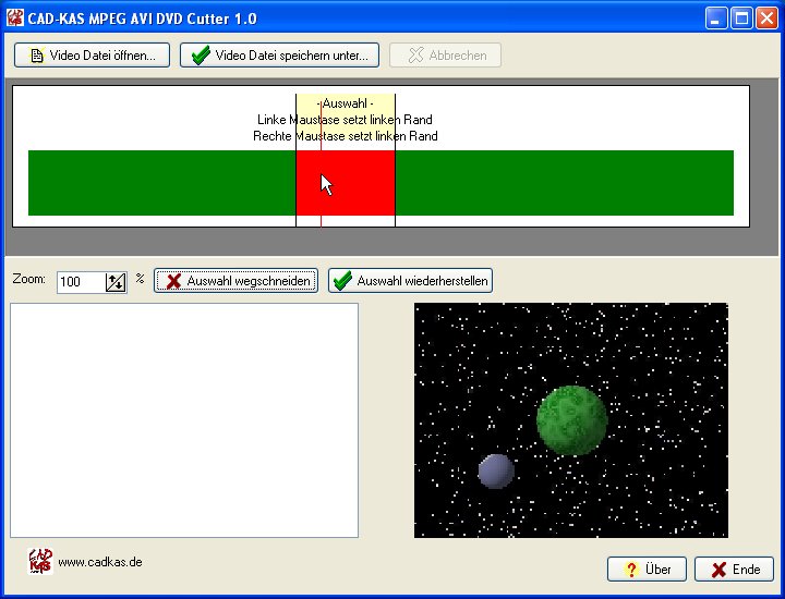 Scheiden Sie unliebsame Teile wie Werbung usw. aus DVD und Videodateien (MPEG und AVI) einfach heraus. Sie markieren zunächst einen Bereich mit der Maus. Dabei sehen Sie bei jedem Mausklick das gewählte Bild in der Vorschau. Dann klicken Sie auf "Auswahl wegschneiden". Dies können Sie mit beliebig vielen Bereichen eines Films machen. Am Schluß speichern Sie noch die neue Videodatei ab. Sie können auch den Film z.B. auf zu CD's splitten, indem Sie zuerst den zweiten Teil wegschneiden und dann den ersten Teil. Ihre Software für die Videobearbeitung.