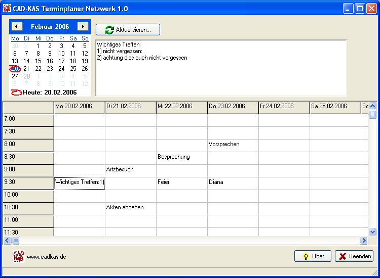 Wollen Sie Termine gemeinsam von mehreren Rechnern aus verwalten (z.B. Rechner vom Chef und Rechner der Sekretärin)? Dann ist dies Ihr Programm! Nie wieder laufen Sie von Rechner zu Rechner, um neue Termine abzugleichen! Alles läuft automatisch und ohne Ihr Zutun. Im Hintergrund läuft eine SQL Datenbank, die keiner Wartung und keiner Installation bedarf. Sie legen das Programm auf einem Netzlaufwerk ab und jeder kann das Programm von dort aus starten, die Termine werden dann zentral in einer Datenbankdatei verwaltet. Ein Datenbank Server ist nicht notwendig, so dass es keine Konfiguration von IP Adressen und Firewall notwendig ist. Wenn Sie ein Backup machen sichern Sie einfach die Datei termine.db3, die alle Termindaten enthält.