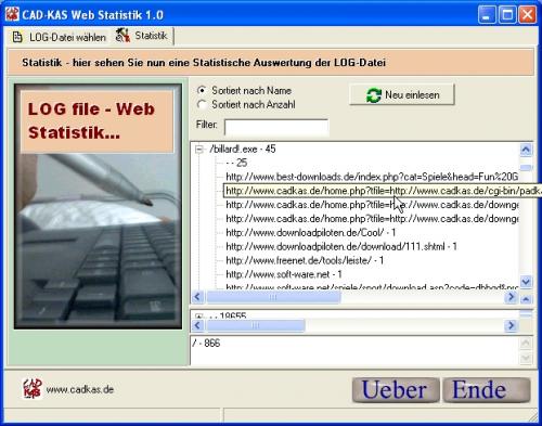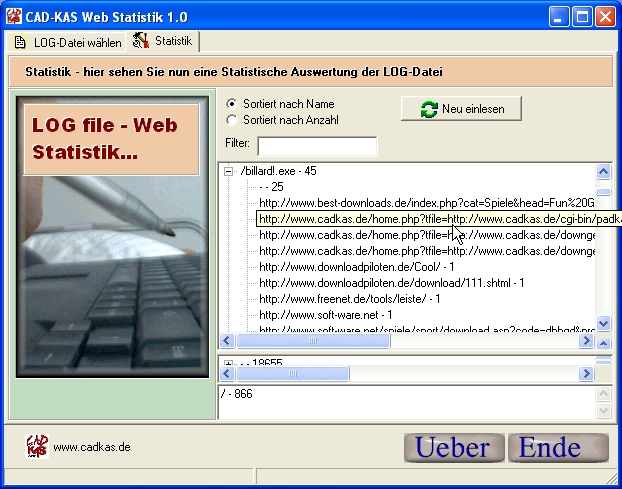 Sie wollen wissen wer auf Ihre Seite linkt, bzw. woher die Besucher Ihrer Seite kommen und auf welche Datei genau der Link führt bzw. welche Dateien von welcher Seite aus heruntergeladen werden? Dies ist kein Problem, denn diese Informationen stehen in den Log Dateien, die Ihr Webserver anlegt. Allerdings erfahren Sie dies leider in den meisten einfachen Statistikfunktionen, die Ihnen z.B. Ihr Provider zur Verfügung stellt nicht. Hier finden Sie nur die man häufigsten angeforderten Dateien und die Seiten von dehnen die meisten Besucher kamen, aber diese Informationen werden nicht miteinander verknüpft! Wenn Sie also z.B. als Shareware Autor wissen wollen von welchen Archiven die Downloads Ihres neuen Programms nun genau kommen, sollten Sie sich dieses Programm ansehen. So finden Sie heraus, ob sich eine Marketingaktion auf einer Archivseite gelohnt hat. Sie sehen wieviel Prozent der Download von dieser Seite kamen und damit wieviel Prozent der Bestellungen. So können Sie einschätzen, ob sich die Werbe-Ausgabe rentiert hat.