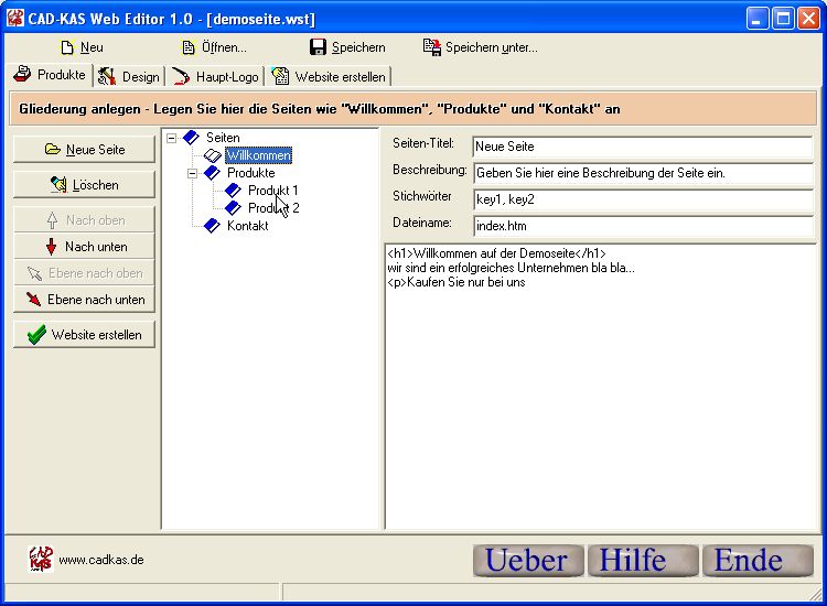 Mit Web Editor können Sie Internetseiten auf eine ungewohnte Art erstellen. Viele HTML-Programmierer kennen das Problem: Frame-Seiten sind einfach zu erstellen, sind aber zur Suchmaschinen Optimierung nicht geeignet und sehen nicht sehr professionell aus. Wer den HTML Code von Hand erstellt, muss für jede Seite immer wieder das gleiche Grundgerüst um den eigentlichen Seitencode legen, damit das Navigationsmenü und die "Frames" drum herum konsistent sind. Dies ist einfach nur stumpfsinnige Arbeit die keinen Spaß macht. Mit Web Editor gibt es nun eine Lösung: Das Programm verwaltet das Naviagationsmenü und erstellt das Grundlayout aus einer Vorlage (kann individuell verändert werden). Sie fügen also nur die gewünschten Inhalte im HTML Code hinzu, müssen sich um nichts mehr kümmern, außer dem eigentlichen Inhalt und dem Design. Sie behalten trotzdem immer volle Kontrolle über den HTML Code.