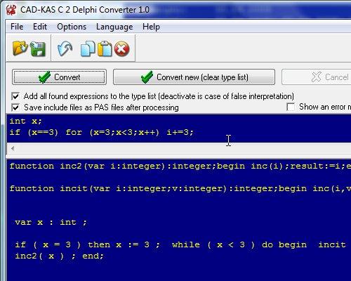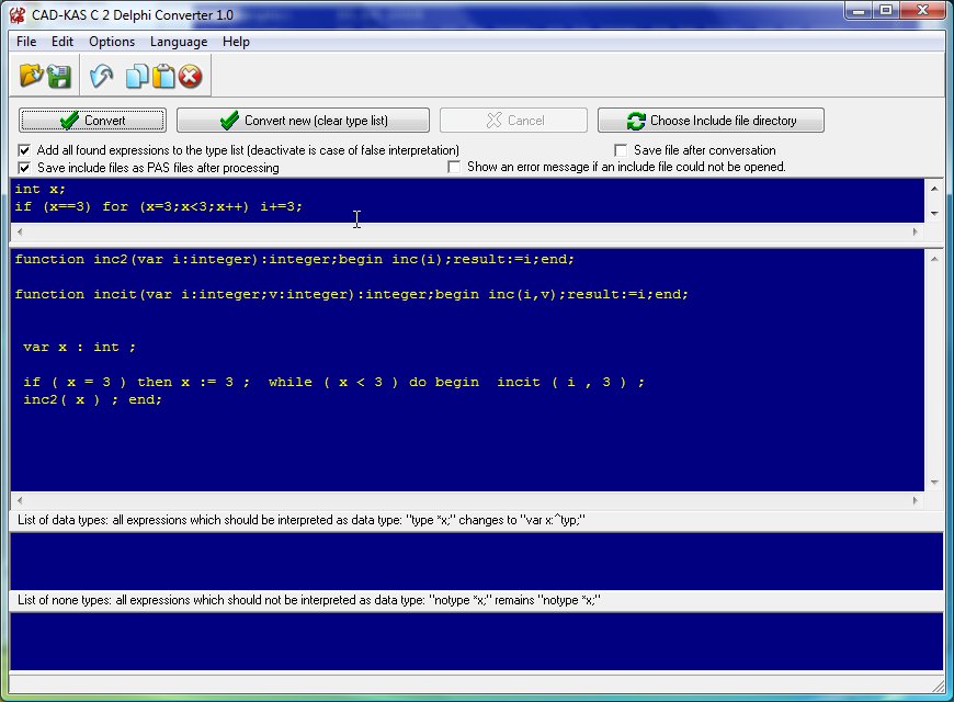 Convert C source code into Delphi/Pascal source code. The program can help you to port existing applications to another new program language. It will change the C syntax into the Pascal syntax. The program has a batch conversion function to process multiple files and can progress include files. After the conversion you will still have to do some changes before you can compile the program under Delphi but the time consuming part has been done.
