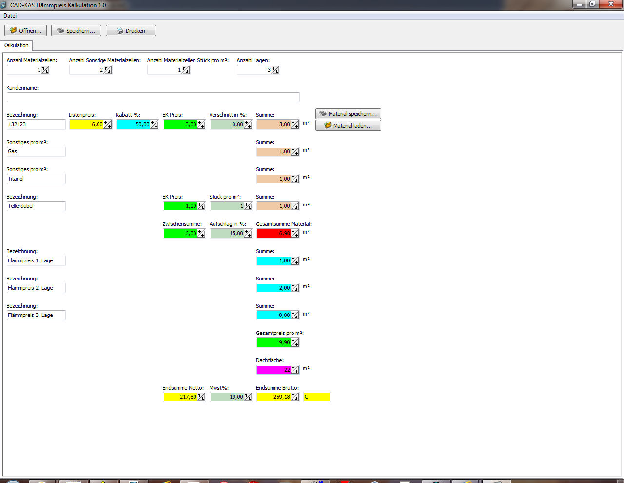 Das Programm berechnet zunächst die Materialkosten pro m².