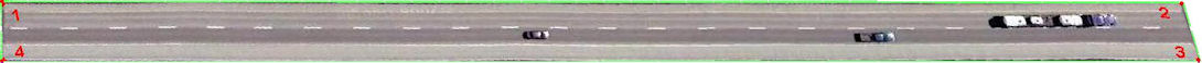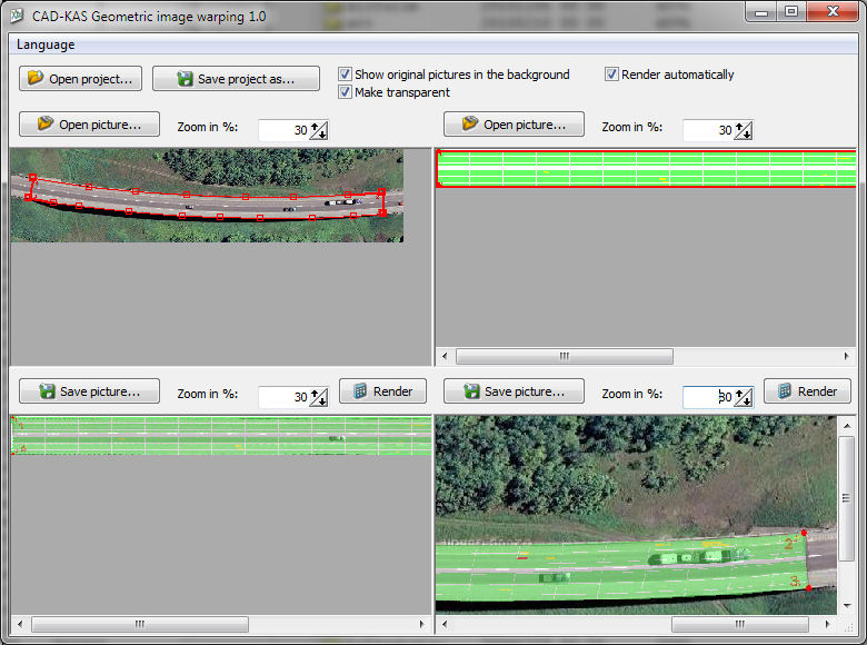 You load both images into the program at the top part. Then you can specify the 4 corners with the left mouse button. But with the right mouse button you can add additional points between the two first and the two last corner points.