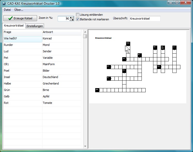 Es kann eine Überschrift über das Rätsel gedruckt werden. Der Seitenrand ist einstellbar. Die Fragefelder können schwarz hinterlegt werden.