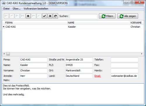 Sie können alle Kontaktdaten Ihrer Kunden verwalten und haben zu jedem Kunden ein mehrzeiliges Freitextfeld. In das Freitextfeld lassen sich alle Informationen eintragen, die Sie möchten und brauchen.