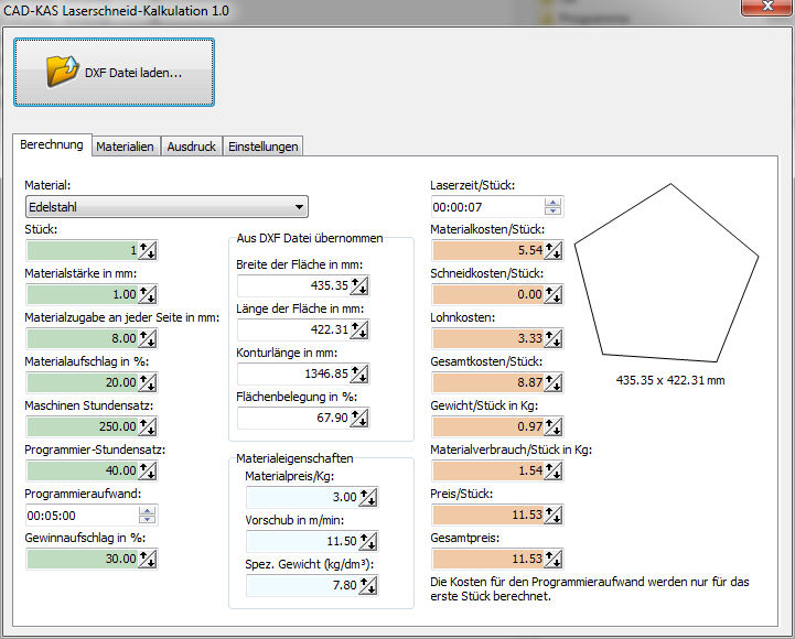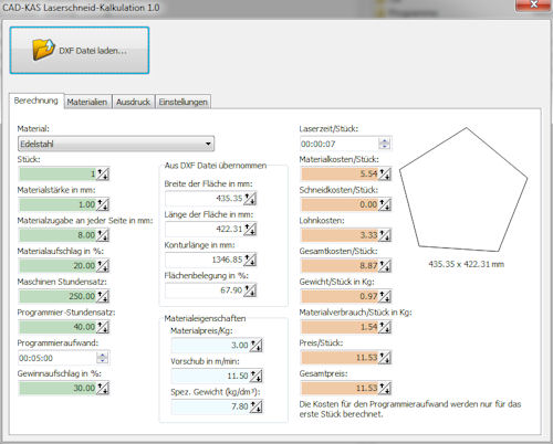Das Programm macht eine Preiskalkulation für einen Laserschneid Auftrag auf Grundlage einer DXF Datei welche Sie ins Programm laden.Es berechnet zunächst die Fläche und die Konturlänge. Diese Werte können auch von Hand eingegeben werden, wenn keine DXF Datei zur Verfügung steht. Daraus wird dann mit der Materialstärke der Materialverbrauch in Kg und der Materialpreis ermittelt.