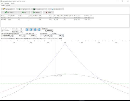 You can add all the options you want to buy or sell and build your strategy. The program shows you the profit and loss graph at expiration and on the day that you select in the program. You can go forward or backward one day with a mouse click.