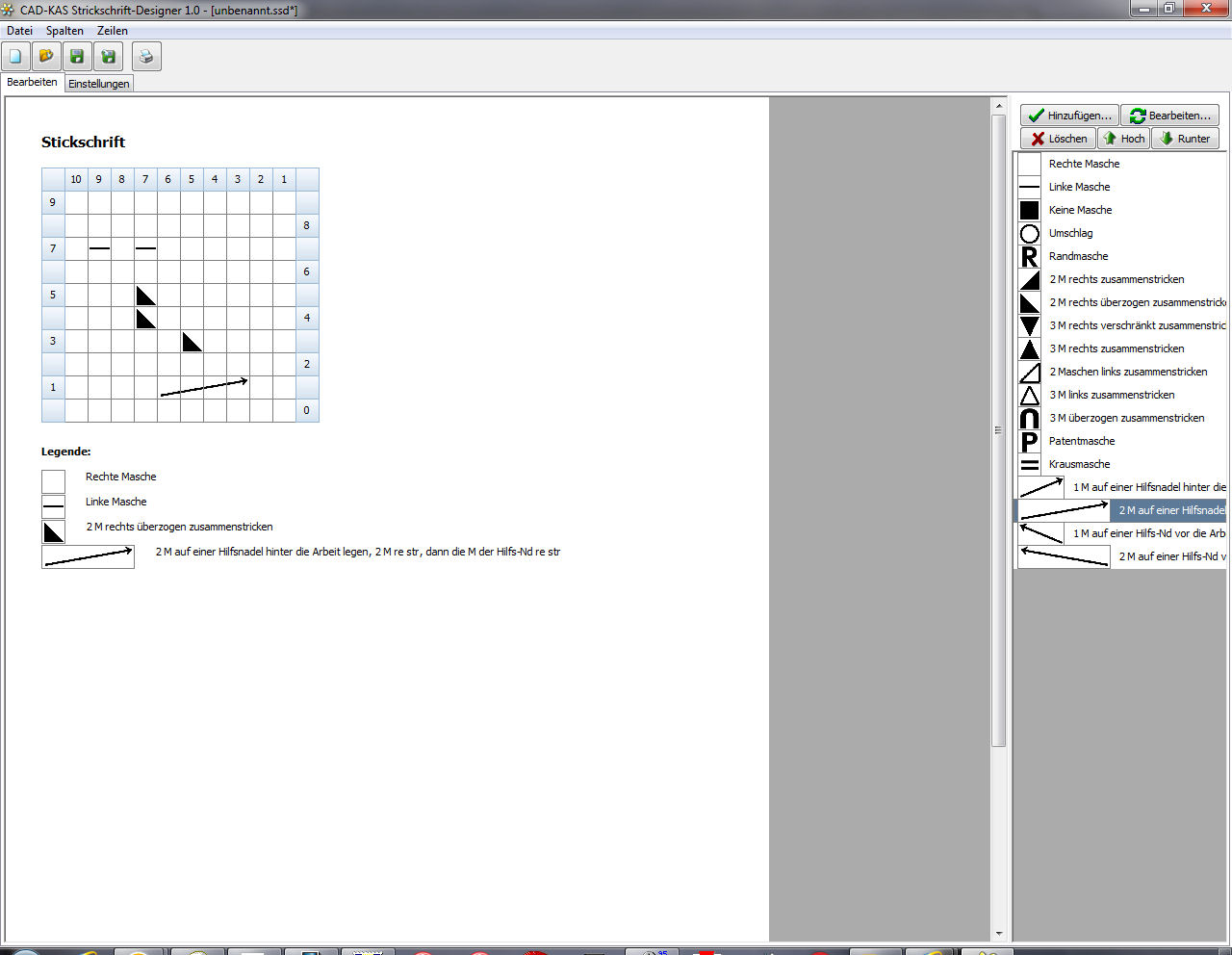 Eine Überschrift und ein freier Text können mit ausgedruckt werden. Unter der Strickschrift kann die Legende der verwendeten Symbole mit ausgedruckt werden.